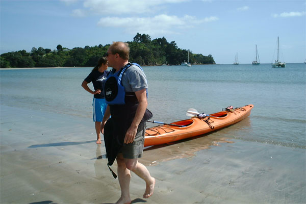Robin gets ready to depart at Oneroa Beach; yachts at anchor in the background.