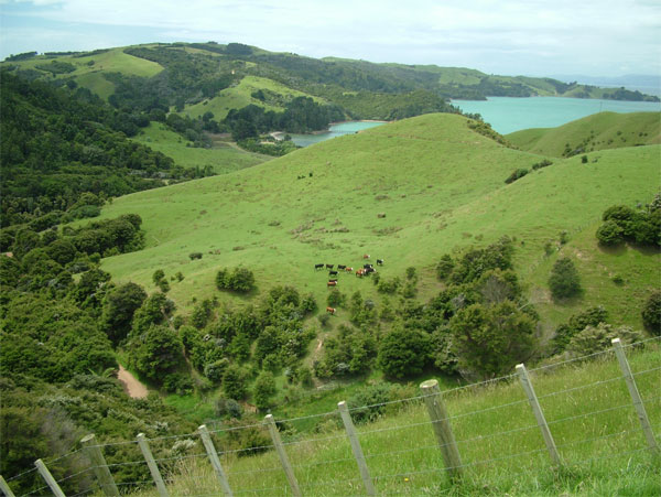 Looking back at Man-O-War Bay, the road climbs high after this point. In fact, we had just passed the cows in the valley and you can see a bit of road.